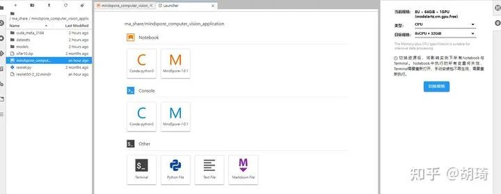 这是一个可以在 CPU 环境运行的案例,使用的是 LeNet 网络 和 MNIST 数据集。具体的实现本文不再赘述,总之这个案例详细介绍了 MindSpore 中数据处理、网络定义、模型训练、模型保存、模型验证等相关知识点。本文关注点在「导出MindIR格式文件」。点击上边或者官方文档的 「Run in ModelArts」 就可跳转到华为云一站式AI开发平台,我们进入的其实是 ModelArts 的 「我的笔记本」功能--一个基于 JupyterLab 构建的在线集成开发环境,还可以快速切换不同环境平台。当前案例使用的是 GPU 环境,MindSpore 版本为 1.0.1 。根据文档并执行代码,我们很快就能实现一个 LeNet 网络并得到训练之后的模型。