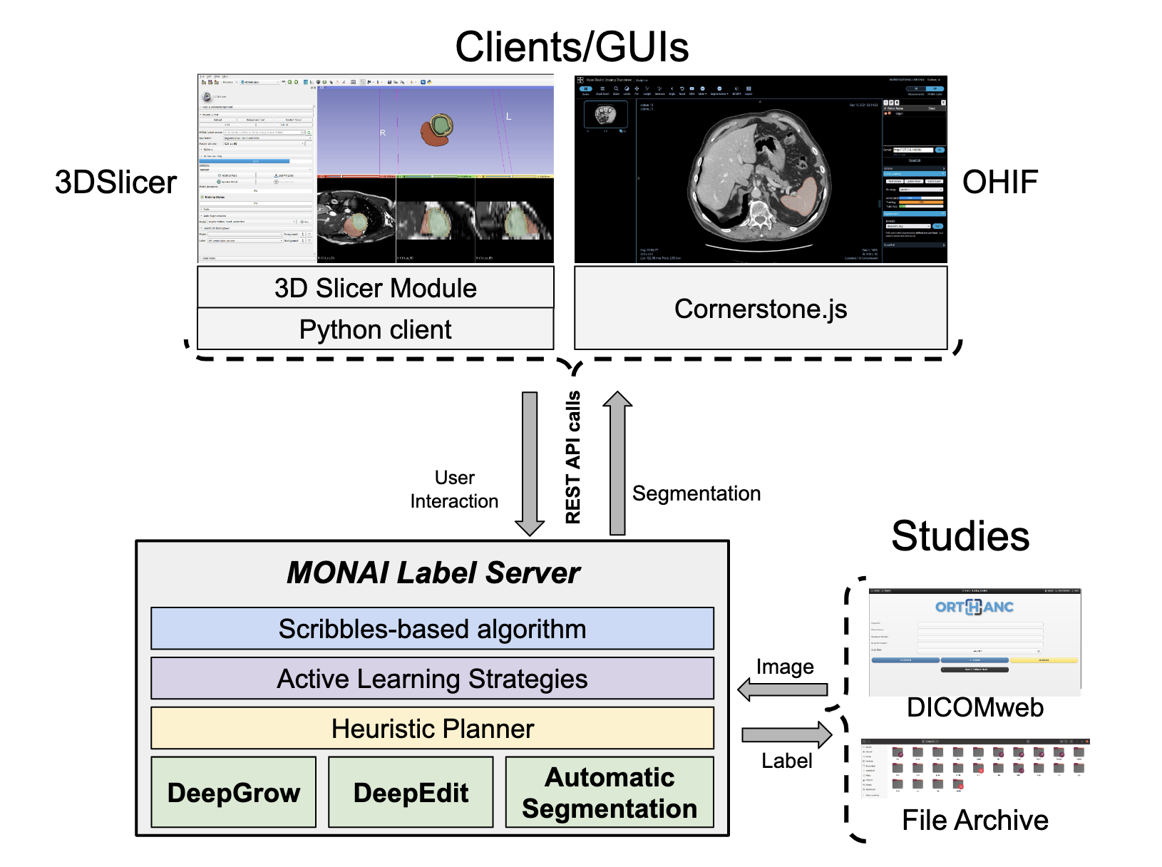在服务器端,提供了一系列 AI 辅助的交互式标注方法,包括基于点击的 DeepEdit 和 DeepGrow 以及基于涂鸦(scribbles-based)的标签细化算法。该服务器还包括主动学习策略和启发式规划器,用于提高底层注释方法的效率。