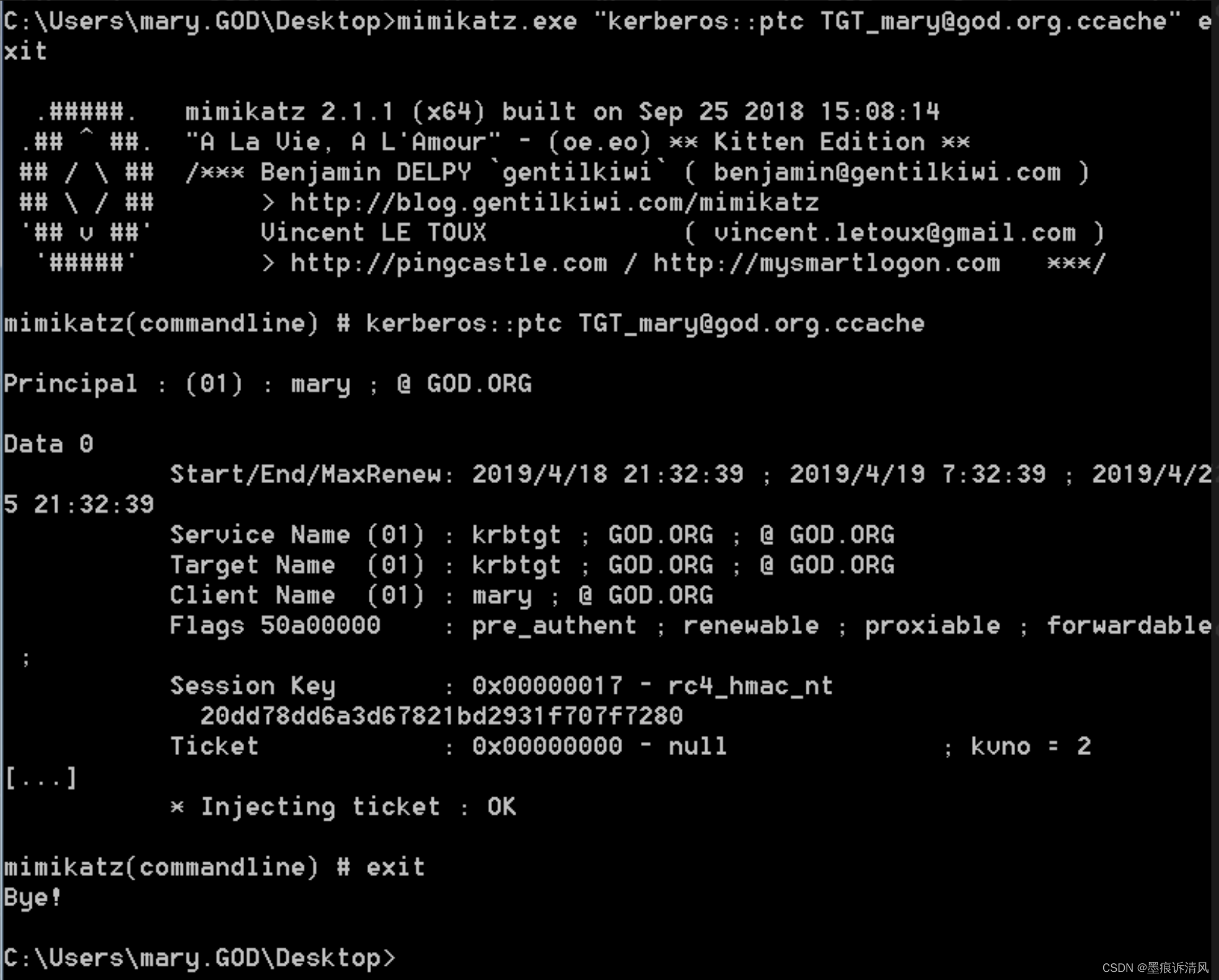kekeo "kerberos::ptt TGT_mary@GOD.ORG_krbtgt~god.org@GOD.ORG.kirbi"