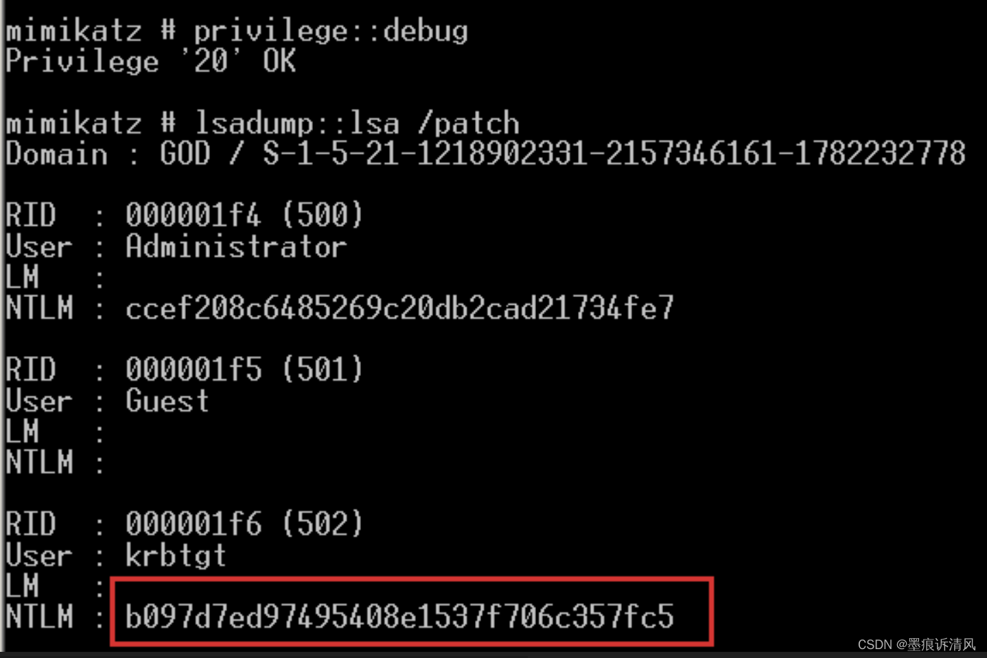 先登录域控制器,dump krbtgt用户的hash值,获取域sid: