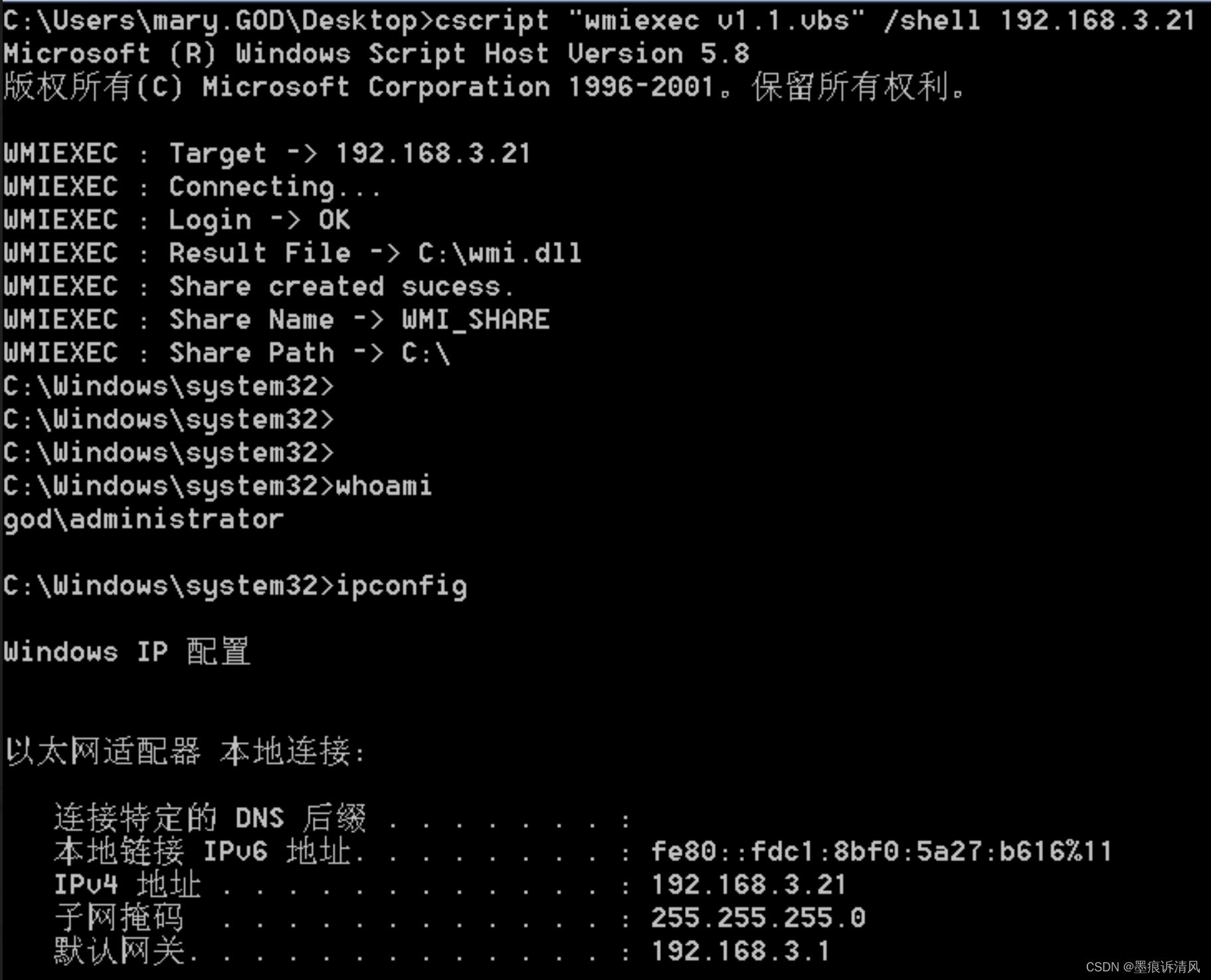 如果主机开启了RPC服务,还可以使用WmiExec.vbs直接连接: