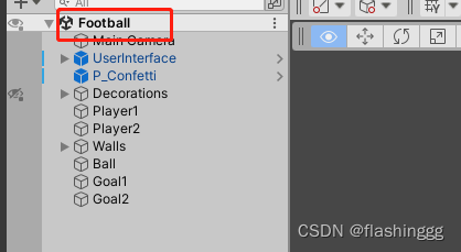 值得注意的是,根节点通常是场景对象(Scene),所有游戏对象都包含在场景中。比如例子中的football就是当前的场景对象。