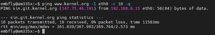 embfly@am335x:~$ ping www.kernel.org -I eth0 -c 10 -q