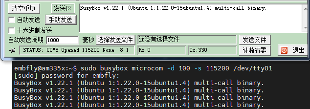 embfly@am335x:~$ sudo busybox microcom -d 100 -s 115200 /dev/ttyO1