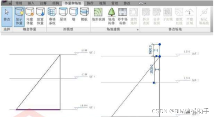 选择菜单上的“体量和场地”——点击“内建体量”,在北立面中绘制三角形,如图3所示。