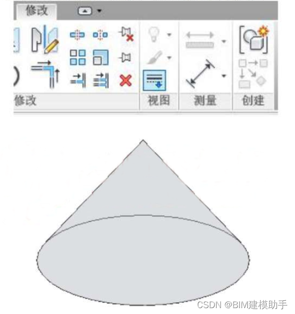 Revit翻模教程教你如何在体量内绘制圆锥,由于在Revit中无法创建“点”这个图元,所以当需要创建锥体时不能直接用一个点和一个面创建形状来生成锥体,在立面上画一个三角形,三角形绕其中的一条边为转一圈,即可得到圆锥,之后用“线处理”,将不需要的线隐藏。