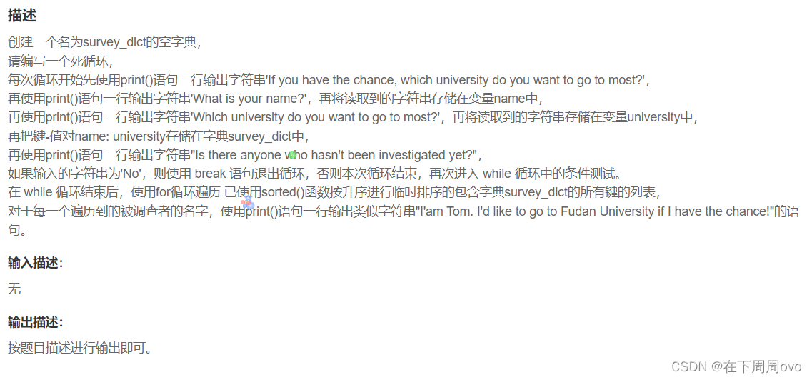 survey_dict = {} while 1: print('If you have the chance, which university do you want to go to most?') print('What is your name?') name = input() print('Which university do you want to go to most?') university = input() survey_dict[name] = university print("Is there anyone who hasn't been investigated yet?") res = input() if res == 'No': break for name in sorted(survey_dict.keys()): print("I'am %s. I'd like to go to %s if I have the chance!" % (name,survey_dict[name]))其中我的代码最后一段: