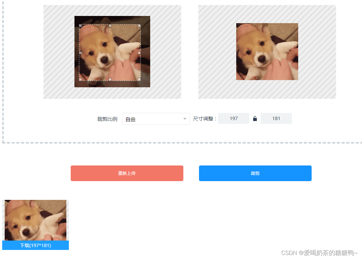 Gif动图上传后,可按比例裁剪也可以通过设置尺寸调整的数据以及拖动灰色裁剪框的方式来裁剪gif动图,完成后,点击“裁剪”。
