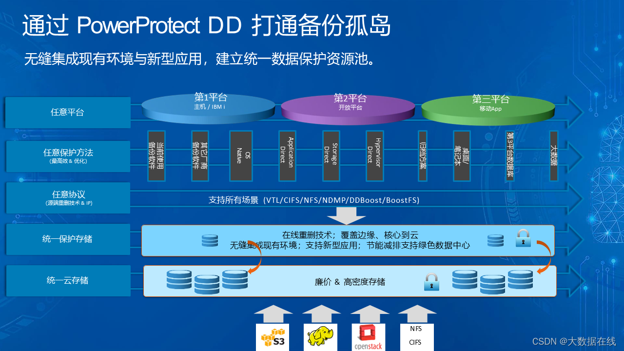除了核心数据之外,企业通常还有一部分重要数据需要保护,重要数据关系到企业业务能否正常运转,不容有丝毫闪失,并且数据规模上也更大。针对这种情况,戴尔科技在“三位一体”架构中间部分提供了强大的容灾(DR)方案,为重要数据提供了全面、高效的保护。而针对海量数据,往往是数据规模大、应用场景多、备份需求复杂。为此,戴尔科技通过备份(BR)方案提供强大的数据备份能力,并且还有可靠、快速、低成本的恢复策略。