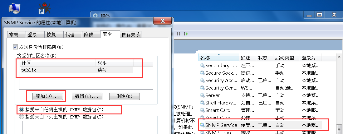 如果是Windows系统则需要在客户机服务列表,开启SNMP支持,并设置好一个团体名称,如下图。