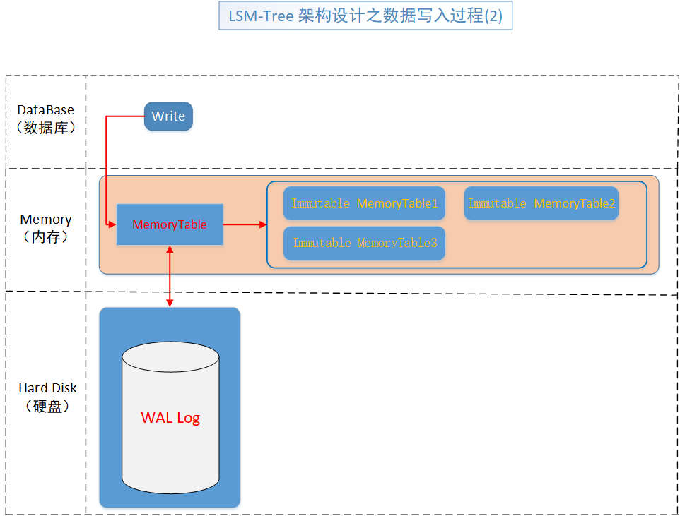 整体包含大致三个部分,数据库操作部分(主要为读和写),内存部分(缓存表和不变缓存表)以及硬盘部分(WAL Log 和 SSTable),这三个部分。
