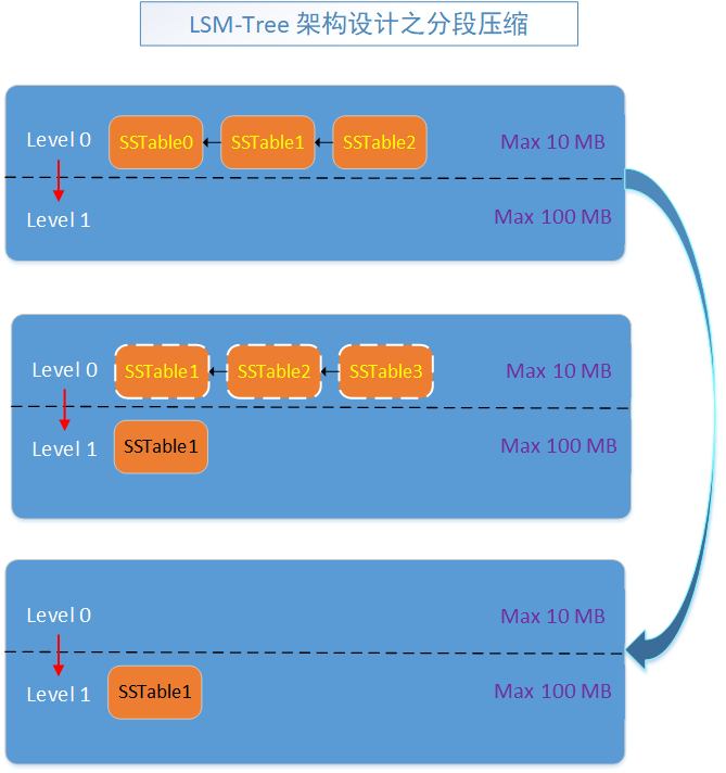 当Level0的所有SSTable文件超过了10M,或者限定的大小,就会从按照WAL.Log的顺序思路,重新合并为一个大文件,先老数据再新数据这样遍历合并,如果已经删除的,则直接剔除在外,只保留最新状态。