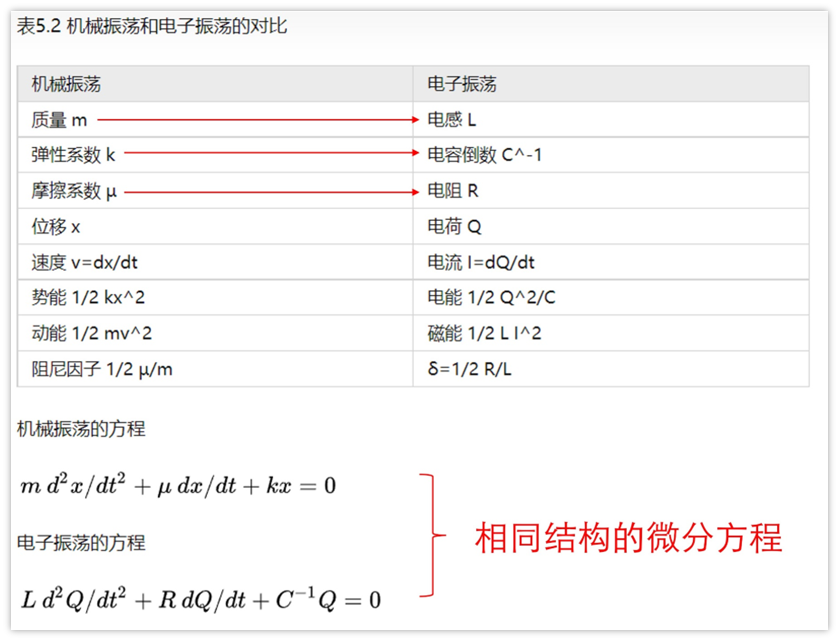 从微分方程可以看到,机械振动最关键的三个量——质量m,弹性系数K,摩擦系数u。正好对应LC振荡的三个量——电感L,电容1/C,电阻R。其实不仅仅这3个量,其它很多物理量也可以对应起来,具体详见表格。