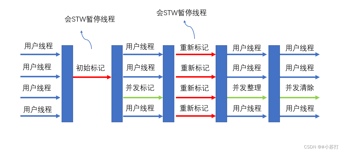 只有在初始标记和重新标记时,会STW,消耗时间很短,而并发标记和并发整理清除消耗时间最长