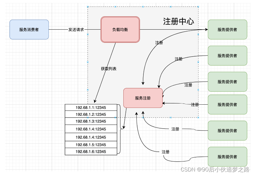 在客户端模式下,如果要进行微服务调用,首先要进行的是到服务注册中心获取服务列表,然后再根据调用端本地的负载均衡策略,进行服务调用。