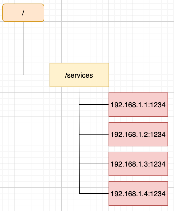假设我们服务提供者的服务名称为 services,首先在 zookeeper 上创建一个 path /services,在服务提供者启动时候,向 zookeeper 进行注册,其注册的原理就是创建一个路径,路径为/services/$ip:port,其中 ip:port 为服务提供者实例的 ip 和端口。如下图所示,我们现在 services 实例有三个,其 ip:port 分别为 192.168.1.1:1234、192.168.1.2:1234、192.168.1.3:1234 和 192.168.1.4:1234,如下图所示: