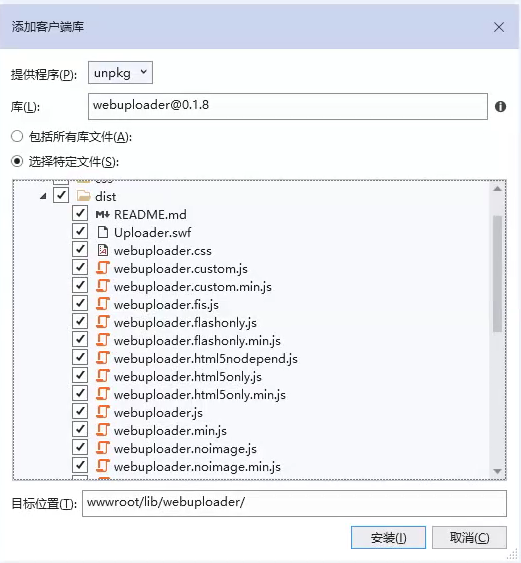 首先,我们引用大名鼎鼎的WebUploader组件库。在项目上右键==>添加==>客户端库 的界面中选择unpkg然后输入webuploader
