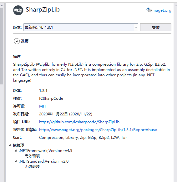 为了实现压缩文件的解压缩操作,我们在Nuget中引用SharpZipLib组件