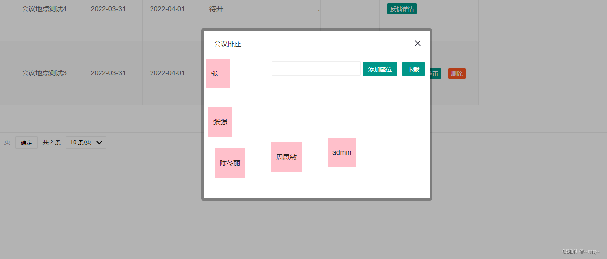 1.查询出本场会议中的所有参与人员 2.需要完成在页面上元素的拖动功能,把对应的参会人员放在指定位置,如:重要的人就放在主位 3.将已经画好的会议座位图,保存下来,并且绑定到本次会议数据上去; 代码的实现顺序是2、1、3