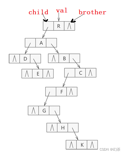 struct Tree{ Tree* child;//指向第一个结点 Tree* brother;//指向其他兄弟结点 int val;//定义一个值来接受数据};