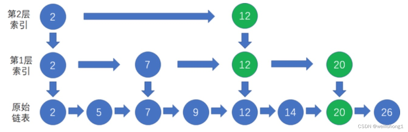 这里的跳表借用了数组,只需要考虑向右查询下一个节点,减轻了向下查询下一个节点的操作;