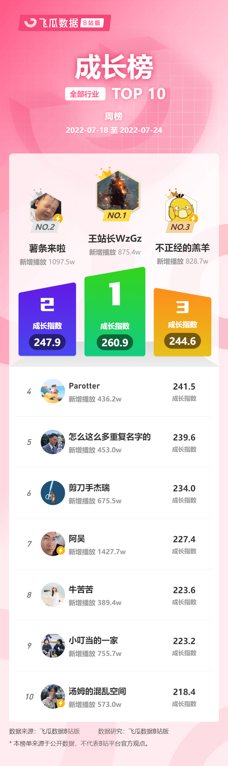 飞瓜轻数发布2022年7月18日-7月24日飞瓜数据UP主排行榜(B站平台),通过充电数、涨粉数、成长指数三个维度来体现UP主账号成长的情况,为用户提供B站号综合价值的数据参考,根据UP主成长情况用户能够快速找到运营能力强的B站UP主。