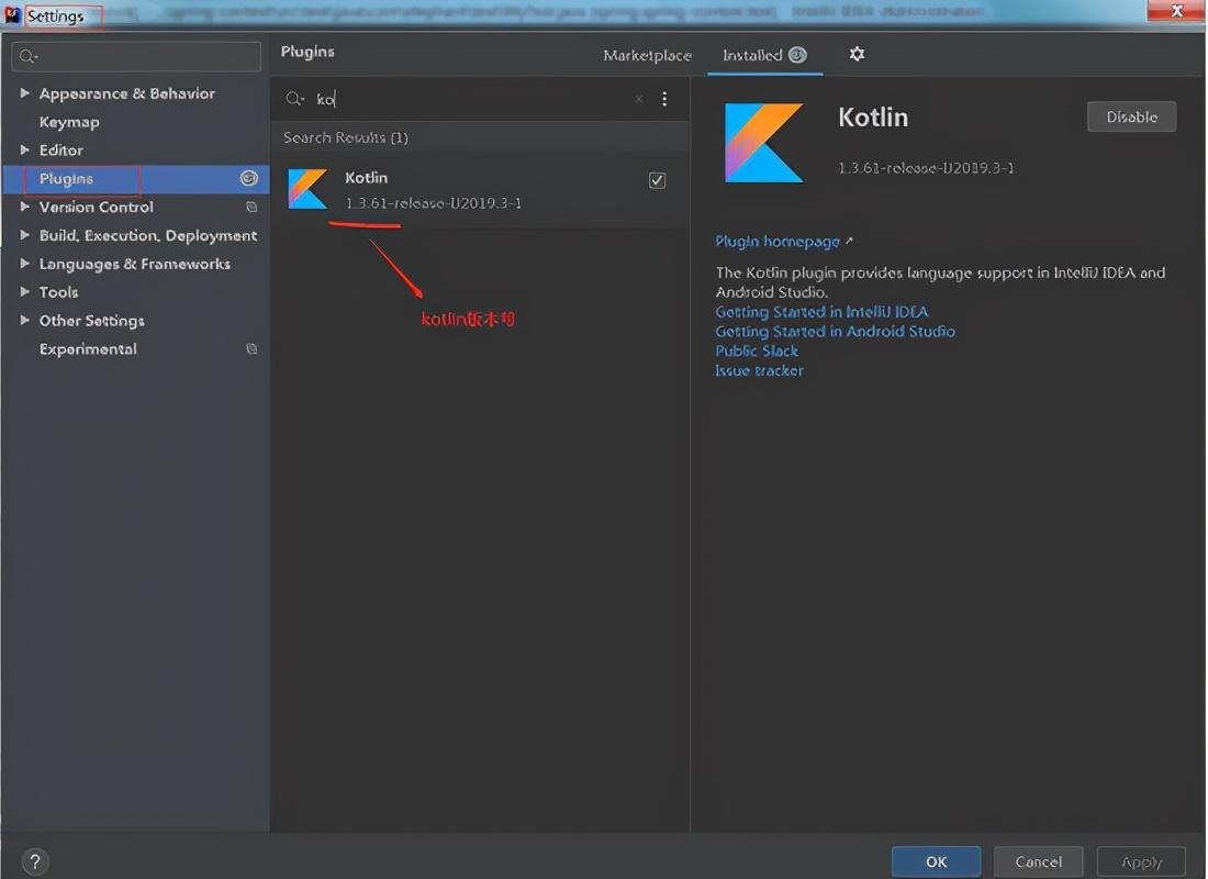 先查看idea的kotlin版本,查看路径:File->Setting->Plugins,搜索kotlin,如果还没安装过先安装一下。