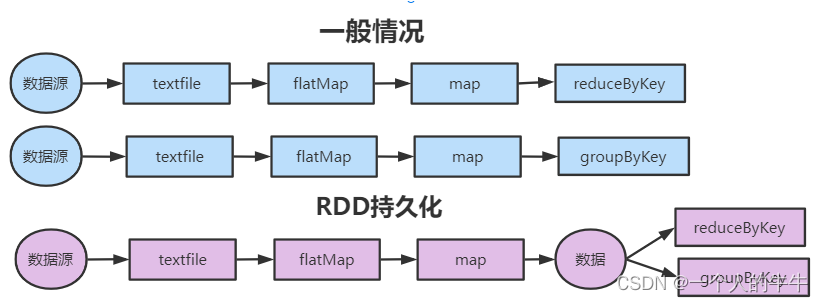 RDD通过Cache或者Persist方法将前面的计算结果缓存,默认情况下会把数据缓存在JVM的堆内存中。但并不是这两个方法被调用时立即缓存,而是触发后面的action算子时,该RDD将会被缓存在计算节点的内存中,并供后面重用。