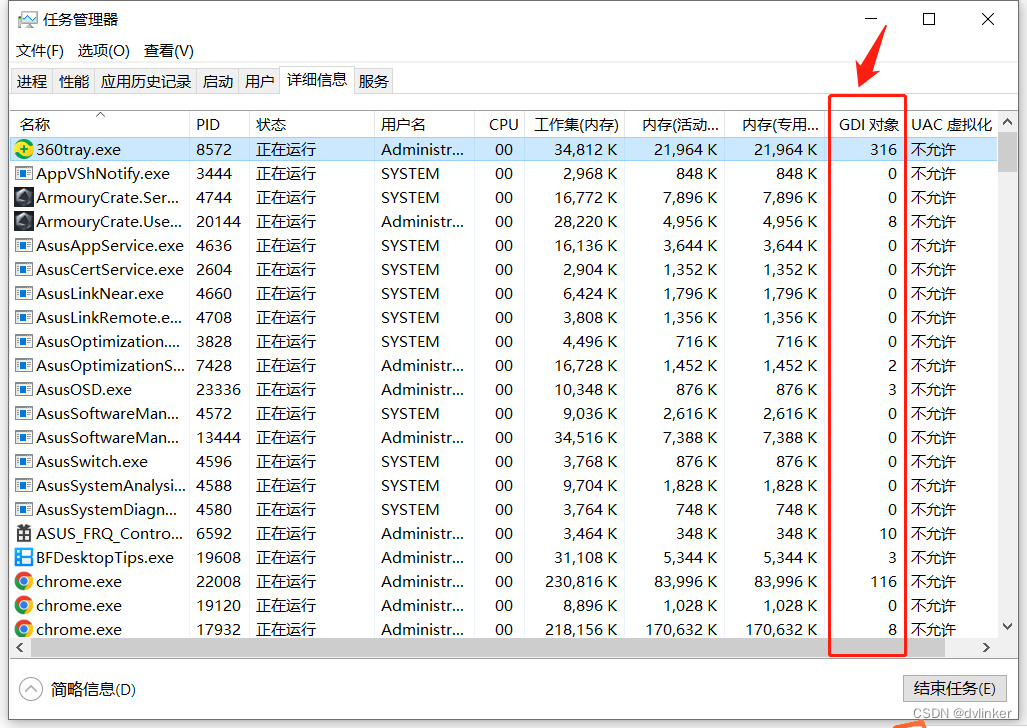 经测试同事反馈,我们的软件在打开部分窗口后关闭,GDI句柄数在每次操作后都会上升6个,多次操作后GDI对象会有明显的较大的飙升现象。可以通过Windows资源管理器来实时监测目标进程的GDI个数:(在任务管理器的详细信息标签页中)