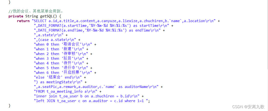 - return "SELECT a.id,a.title,a.content,a.canyuze,a.liexize,a.zhuchiren,b.`name`,a.location\r\n" +