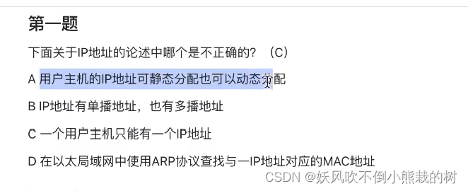 动态分配使用DHCP协议进行动态分配(点击自动获取ip) ip地址有单播、多播、广播地址 ipv6还有任播 一个主机有多个网卡就会有多个ip地址