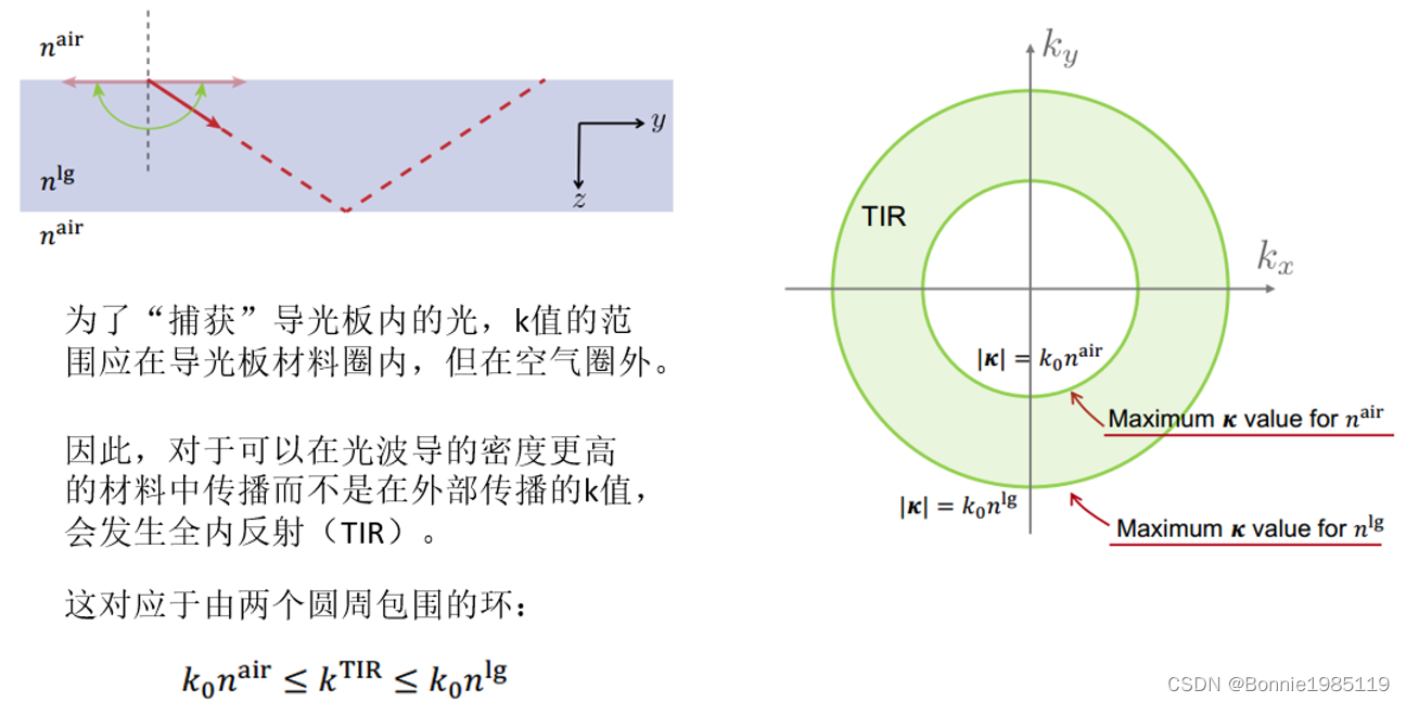 用于增强和混合现实应用的光导设备必须同时实现两个功能:它们必须允许环境散射的光通过(即透明),同时将要叠加的人造图像从发射器传输到用户的眼睛。这通常是通过透明光波导实现的,在透明光波导中,光可以在TIR(全反射)作用下传播,并与光导表面上不同类型的光栅结构相结合,以耦合光进出。在VirtualLab Fusion中,k-Layout可视化工具提供了一种在k域中强大的图解方法,用于分析特定光波导布局的光导和耦合条件。