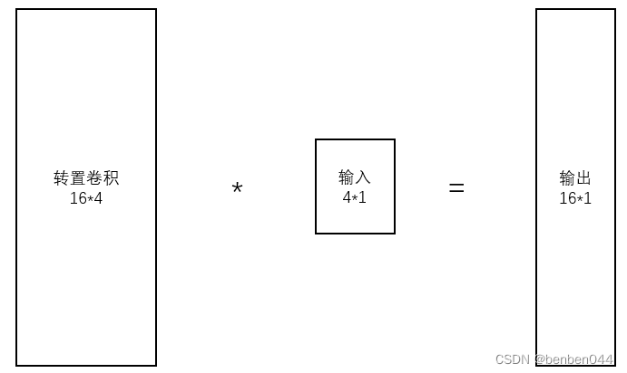 而上采样则相反,我们希望2*2 -> 4*1的输入得到16*1 -> 4*4的结果,此时就需要使用到16*4的矩阵,从正向的4*16矩阵变为16*4的转置矩阵,故而得名转置矩阵。