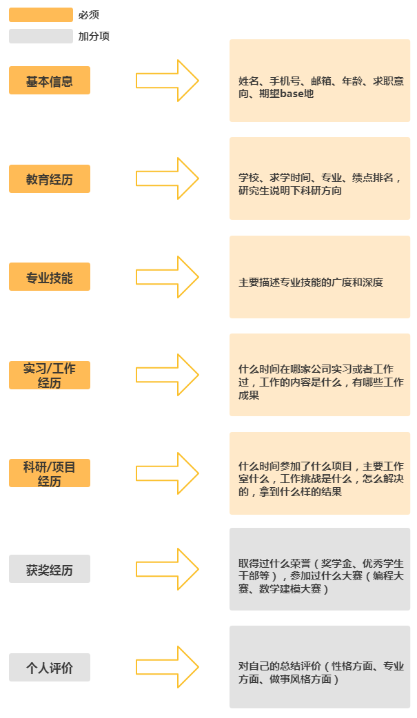 一份完整的简历由下图几个部分组成,我们分别来看下这几部分的内容该怎么写才能赢得面试官的青睐。
