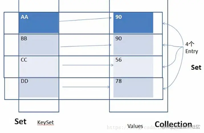看起来就像是数据库中的关系表,有两个字段(或者说属性),keyset(键的集合)和values(值的集合),每一条记录都是一个entry(一个键值对)。