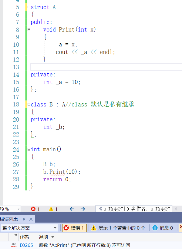 struct A { public: void Print(int x) { _a = x; cout << _a << endl; } public: int _a = 10; }; class B : public A { private: int _b; }; int main() { A a; a._a = 30; B b; b._a = 10; a = b; cout << a._a << endl; cout << b._a << endl; return 0; }
