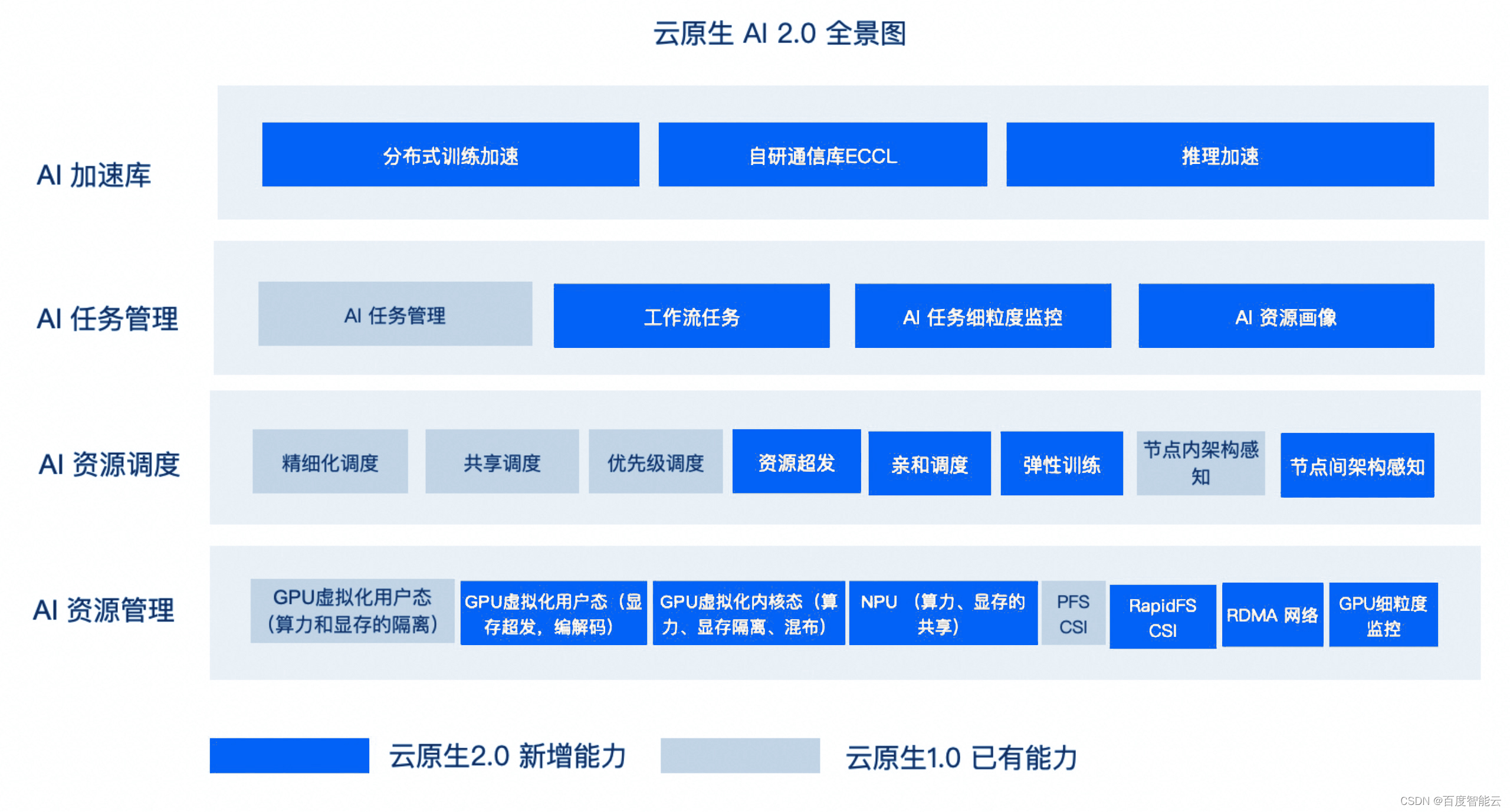 近日,百度智能云发布云原生AI 2.0方案,方案将百度自身超大模型训练(文心等)经验,资源管理和资源利用率优化经验,多场景工程实践经验充分吸收融合,用标准化的能力帮助企业应对缺乏大模型训练经验而导致的资源利用率低等问题,加速AI应用落地。该方案在资源弹性、跨节点架构感知、训练推理效率等方面做了重点升级。