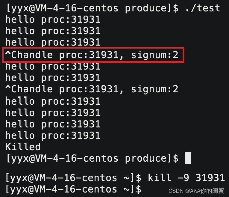 如图所示,键盘输入^C能够对进程发送2号信号SIGINT,输入^C就会触发进程提前注册好的对2号信号的处理动作。