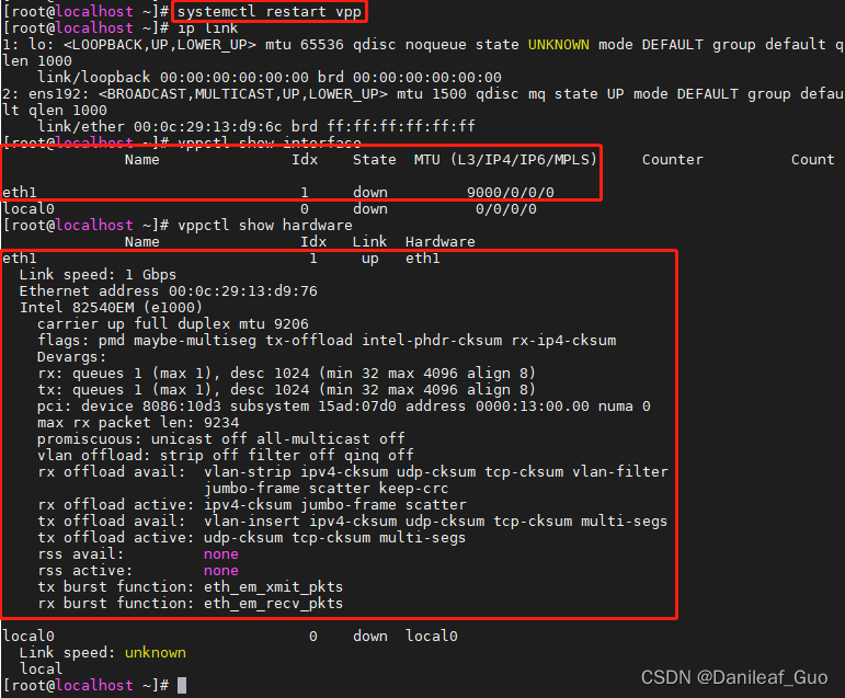 可以看到,在宿主机上已经看不到ens224接口了,对应的,可以在VPP中看到eth1接口。