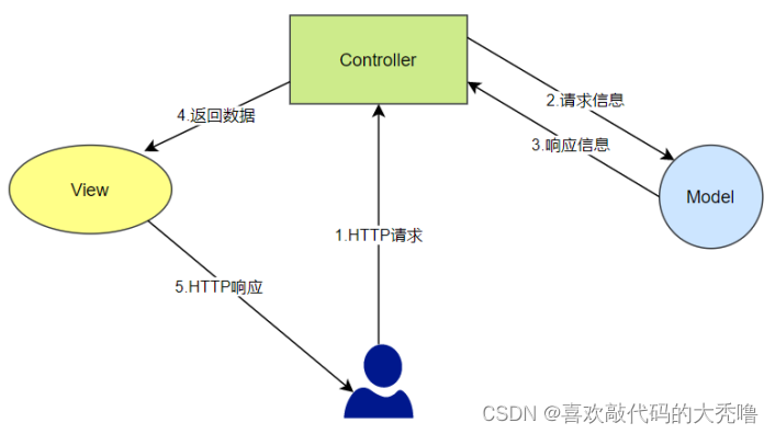 - Controller(控制器):处理请求和响应。通常控制器负责从试图中读取数据,控制用户输入,并向模型发送数据。