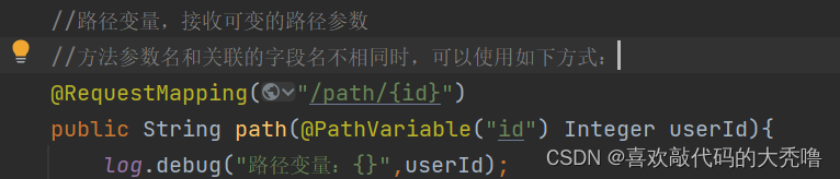 根据id来查询用户信息,就拥有一个id字段作为请求数据:/path/query/123,可以把/123部分先用一个变量来表示,然后在方法参数上关联这个变量: