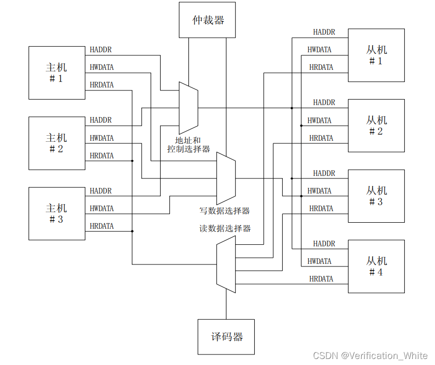 AHB总线由Master、Slave和Infrastructure构成。Infrastructure由arbiter、数据多路、地址控制多路、译码器构成。