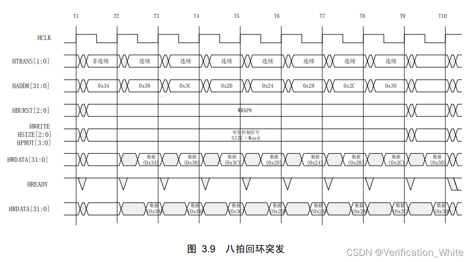 需要注意,HREADY信号在数据有效期间必须为高,并且延续到第三个周期的上升沿之后,确保master的正确采