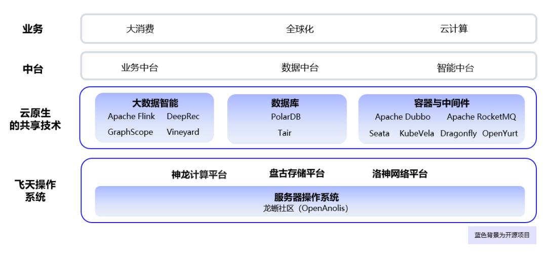 阿里的系统架构,可以简化地分为四层,底层是基座“飞天操作系统”,之上是云原生共享技术,再往上是共享的能力中台,顶层是丰富的数字化的业务应用。