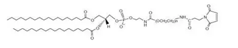 常用于与脂质双分子层靶向给药以提高药物溶解性,PEG提供隐身性,延长循环半衰期,减少非特异性蛋白结合或细胞粘附,马来酰亚胺反应与抗体、适配体、蛋白质、多肽等靶向分子结合。