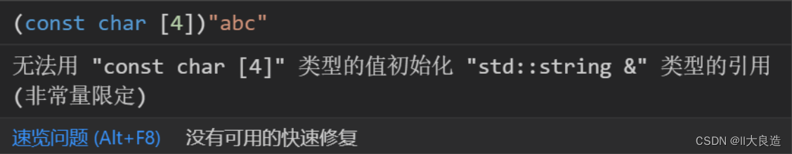 原因在于:d是左值(有名对象),Demo()是右值(匿名对象/临时对象)。在之前的编码过程中我们很有可能几乎都没遇到过这种问题,因为C++对const&添加特殊技能:既能接受左值又能接受右值。上面两个例子把函数参数加上const,即void Print(const string& s)和void Func(const Demo &),问题就解决了。void Func(const Demo &)类型匹配解决了,为什么void Print(const string& s)也可以了呢?因为编译器自动把根据函数参数类型string,自动为"abc"构造一个临时对象string("abc"),这是默认类型转换。