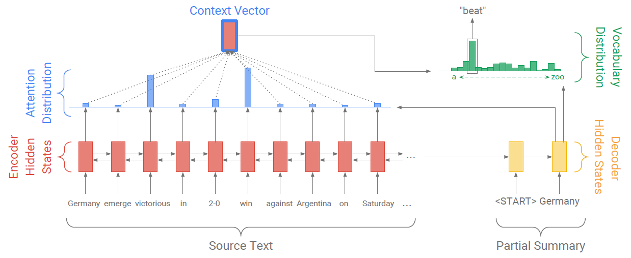 指针生成网络是基准网络与指针网络的混合,它允许通过指针复制单词,同时可以从固定词汇表生成单词。在前述章节中,已经获取了注意力分布
