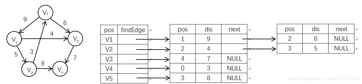 对于图 G 的每个顶点 vi,将所有邻接于 vi 的顶点链成一个单链表,称为 vi 的边表,若图 G 是一有向图,则称为 vi 的出边表。